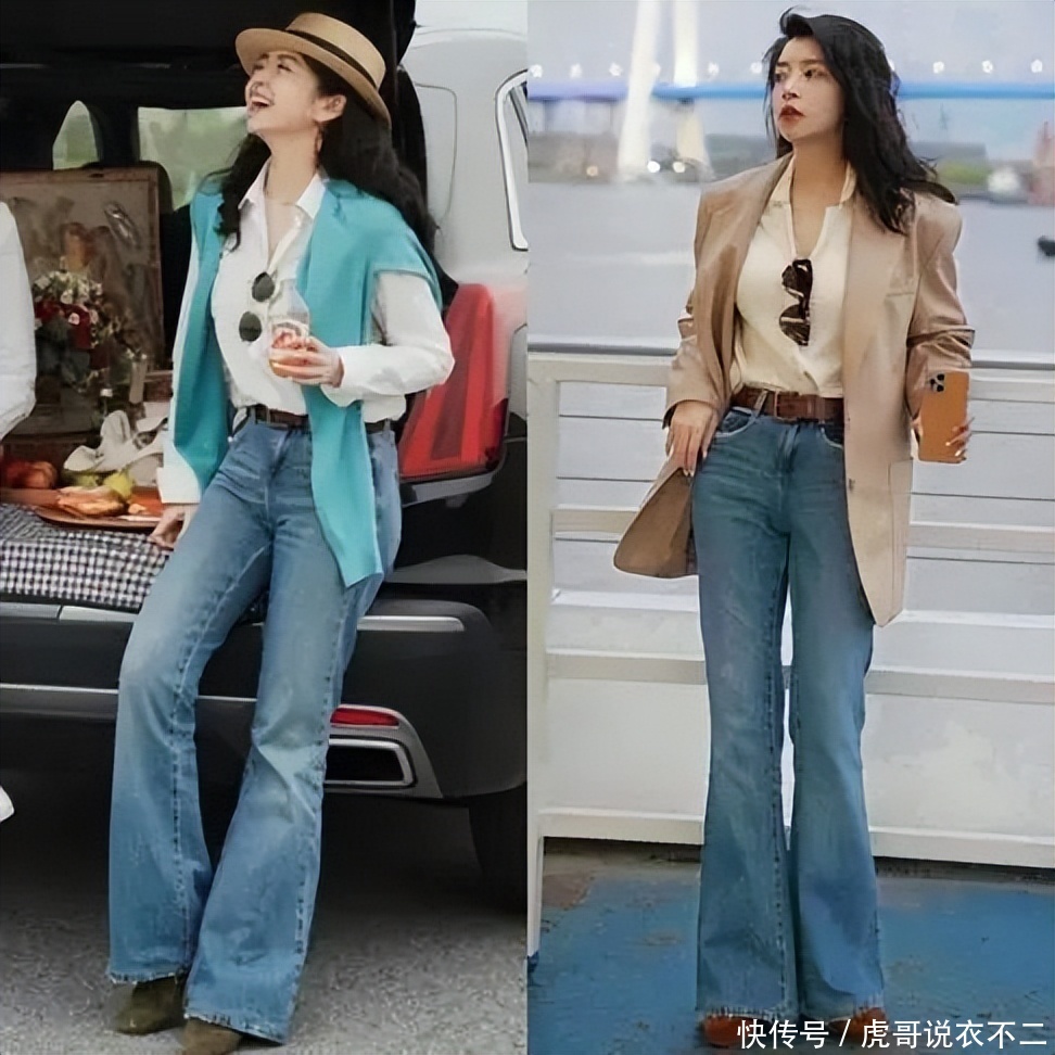 而喇叭腿的裤装在筹算上刚好相背,裤腰的部分比拟窄,偏向修身,裤脚的位置超等宽松,显腿长的恶果一流。